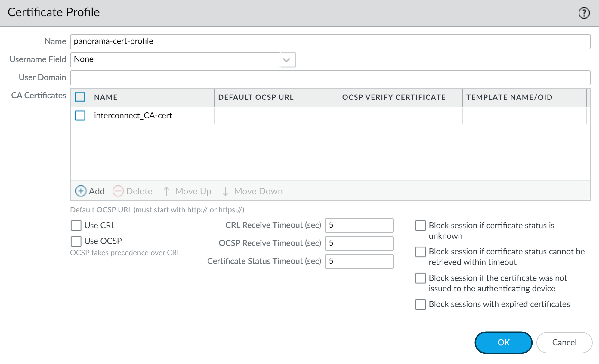 - Select PanoramaCertificate ManagementCertificate Profile and Add a new Certificate Profile.Enter a Name for the Certificate Profile.Add the CA certificate you previously created.Click OK to finishing adding the Certificate Profile.