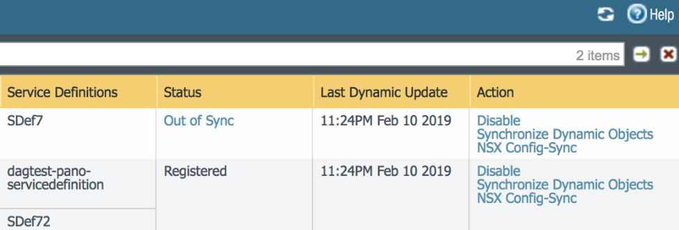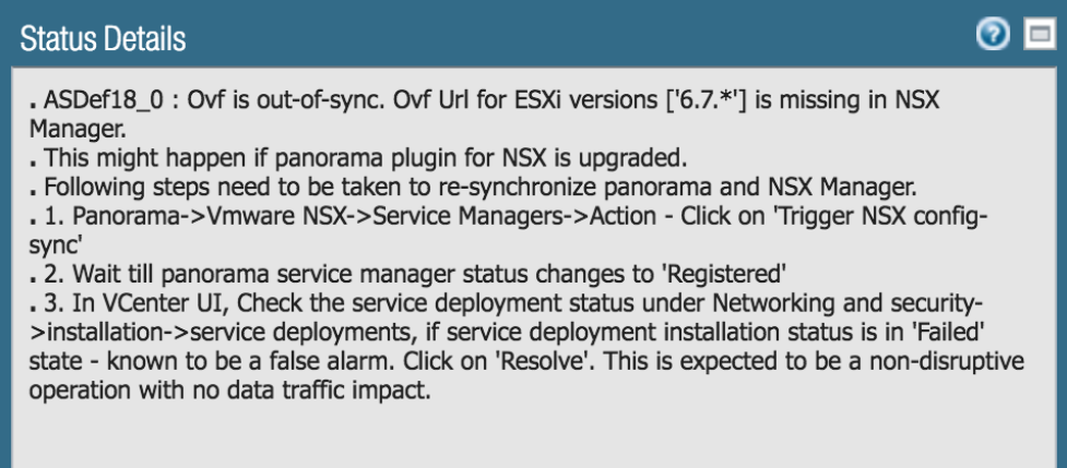 After installing VMware NSX plugin 2.0.4, when Panorama and pushes an OVF file to NSX Manager, the Service Manager status on Panorama goes Out of Sync. The VMware NSX plugin 2.0.4 automatically adds support for ESXi 6.7 to each of your service definitions. However, this causes a mismatch between the plugin and your existing service definitions and requires a resolve to complete the update.Complete the following procedure to synchronize Panorama and NSX Manager.- Log in to the Panorama web interface.Select PanoramaVMware NSXService Managers and check the status of your NSX Manager(s). Clicking on Out of Sync to view the details shows the following message.