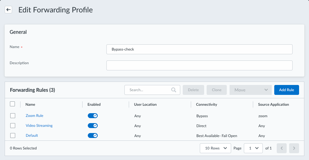 Set the rule priority to ensure bypass rules are evaluated in the correct order relative to other forwarding rules. You can select a forwarding rule and move it up or down in the Forwarding Rules table.Select a Traffic Enforcement option if needed.Save your forwarding profile settings.Push the configuration to deploy the bypass rules to your Prisma Access Agent deployment.Verify that bypass rules are working correctly on an endpoint.