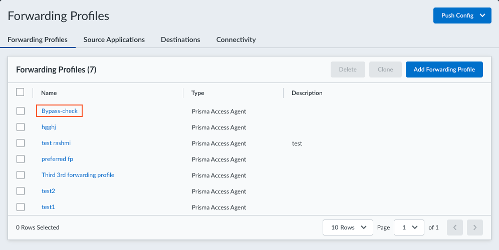Set up the Source Applications or Destinations for which you need to bypass traffic.For example, you can specify a Destination for a domain you want to bypass, or specify the IP addresses for the applications you want to bypass. You can also set up specific Source Applications that you want to bypass.Configure a forwarding profile where you want to specify bypass rules.- Select an existing forwarding profile you want to modify or add a forwarding profile.For example: