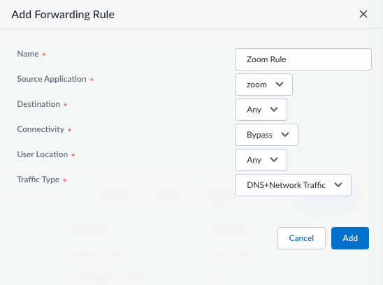 In the Forwarding Rules section, select an existing forwarding rule or Add a forwarding rule for the source application or destination you want to bypass.