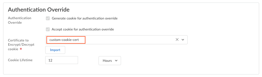 Select Authentication Override, and in Certificate to Encrypt/Decrypt Cookie, select the certificate that you uploaded to Panorama.