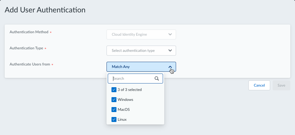 Select the endpoint operating system to Authenticate Users From. Selecting Match Any will authenticate users from all supported operating systems. The default is Match Any.