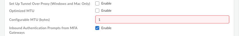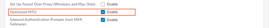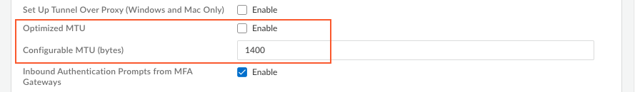 • By default, Optimized MTU is Enabled. The MTU is the largest packet size that Prisma Access Agent can send in a packet during a transmission. To automatically determine the best MTU to use for packet transmissions, make sure this option is Enabled.