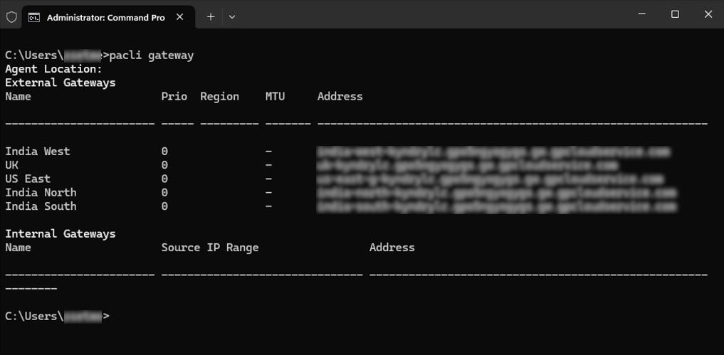 • Use the pacli gateway command to display the last MTU detected for the current list of gateways. For example: