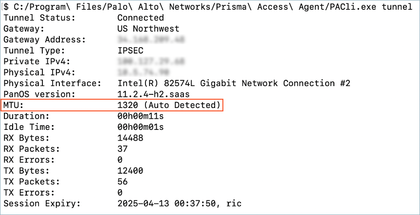 • Use the pacli tunnel command to display the current connection (tunnel) MTU. For example:
