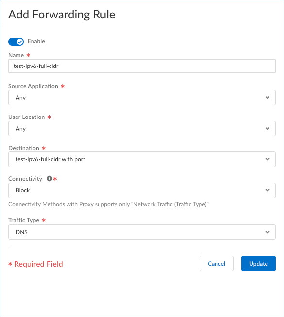 3. Select a Connectivity option such as Direct, Block, Bypass, Best Available - Fail Safe, or Best Available - Fail Open. You can also select a custom connectivity object if you created one. Proxy and Advanced DNS Security Resolver are not supported at this time.
