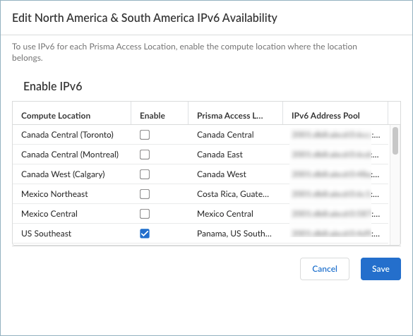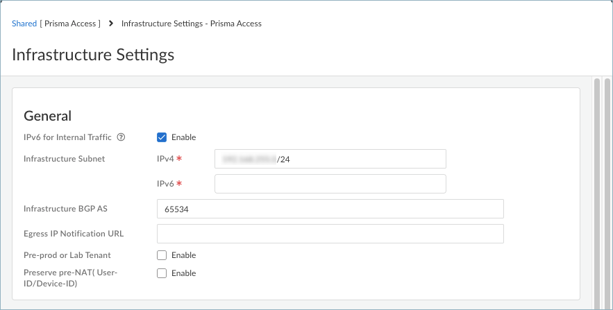 1. In Strata Cloud Manager, Select ConfigurationNGFW and Prisma AccessConfiguration ScopePrisma AccessPrisma Access Infrastructure and select the gear icon to edit the Settings.