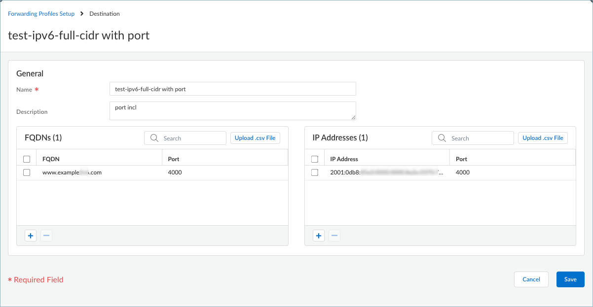 2. In Forwarding Profiles Setup, select the Destinations tab and select the destination object where you want to add IPv6 addresses.