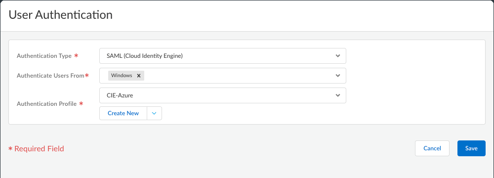 - Go to ConfigurationConfigure NGFW and Prisma Access and make sure the authentication profile mapped in the SAML user authentication is mapped to the Azure AD or Entra ID as the IdP.