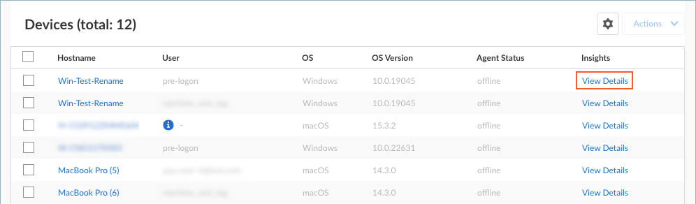 - In Strata Cloud Manager, select ConfigurationEndpoint Management.In the Devices table, navigate to the device for which you want to view the diagnostics, and select View Details in the Insights column.