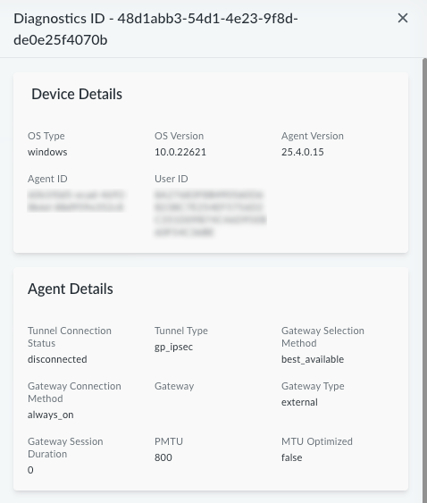 You can also download the diagnostics bundle (in JSON format) by selecting the check box next to an entry in the table and clicking Download.View the diagnostic information for the device, including Device Details and Agent Details.