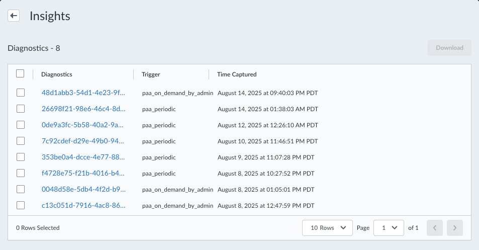 View the details of a specific diagnostic.- Select a diagnostic from the list of available diagnostics for the device. Each diagnostic contains a unique ID, an indicator of what triggered the diagnostic, and the timestamp when the diagnostic was captured.The following are examples of some possible triggers: