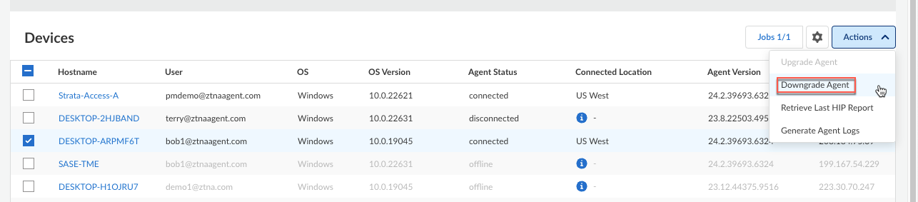 If you are viewing the details for an individual agent, you can also select Actions from the individual details view.The downgrade agent action is not available to administrators with the View Only Administrator role.In the Confirmation dialog, click Yes to confirm the downgrade operation.The Jobs button appears to indicate that the downgrade job has been added to the queue.
