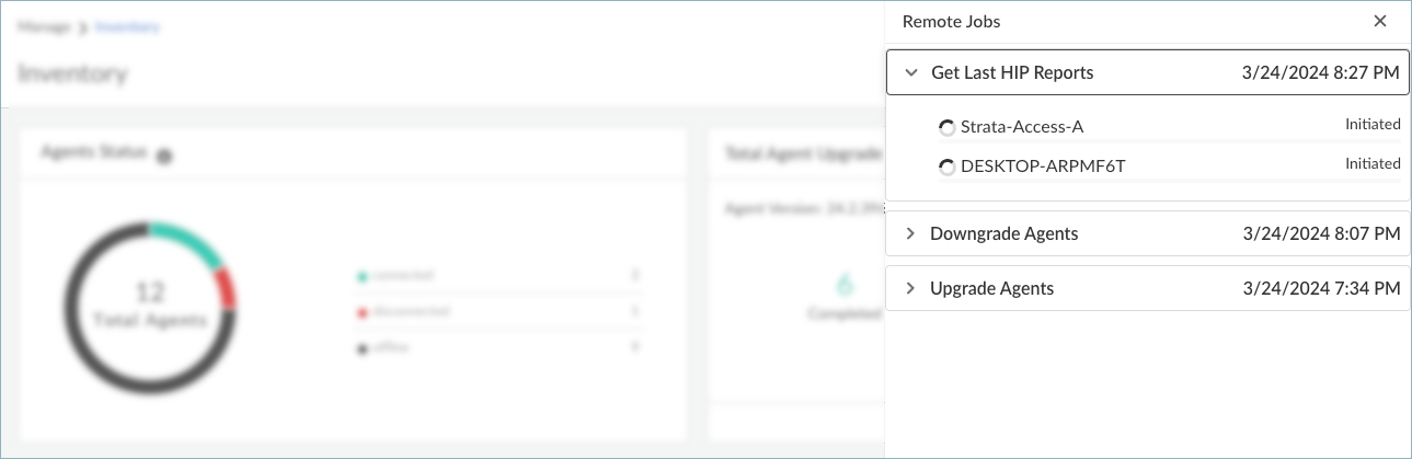 If you are viewing the details for an individual agent, you can also select ActionsRetrieve Last HIP Report from the individual details view.The retrieve last HIP report action is not available to administrators with the View Only Administrator role.In the Confirmation dialog, click Yes. The Prisma Access Agent sends the HIP report to the compliance service, which saves the HIP report and provides the service to download HIP reports.The Jobs button appears or changes to indicate that the download HIP report job has been added to the queue.