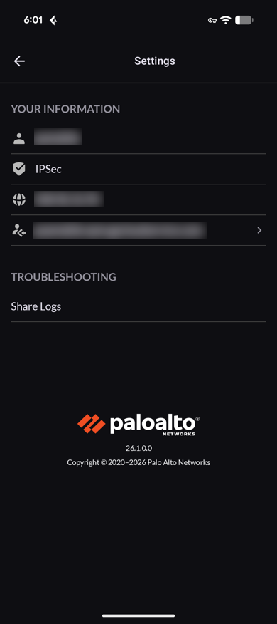 You can view Prisma Access Agent connection details and access troubleshooting options on the app's settings page.