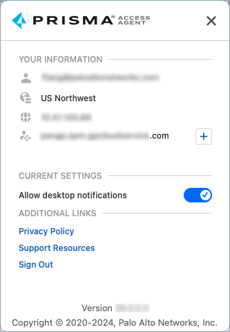 The hostname or IP address for the server that you're connected toTo receive Prisma Access Agent notifications in the menu bar (on macOS) or taskbar (on Windows), Allow desktop notifications. This setting is enabled by default.To understand what data the Prisma Access Agent collects and how the information is used, view Our Privacy Policy.To get assistance on the Prisma Access Agent, click Support Resources.If your administrator permits it, Sign Out of the Prisma Access Agent.View the version of your Prisma Access Agent.To close the window, click the X.