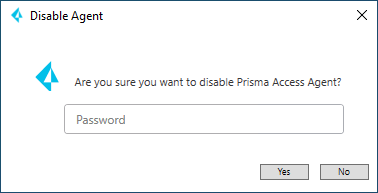 (Prisma Access Agent version 25.3.0.43) If your administrator requires a one-time password (OTP) to disable the agent, enter the password and click Yes on Windows or OK on macOS. If you don't have the password, contact your administrator for the password.For example, on Windows: