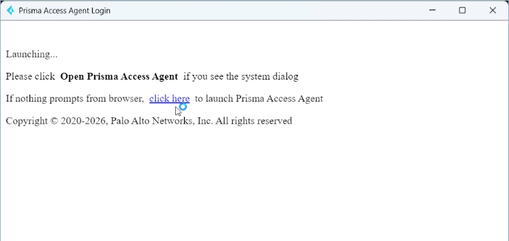 - Depending on your agent configuration, the Prisma Access Agent internal embedded browser or your default system browser will appear. The following image is an example of the embedded browser: