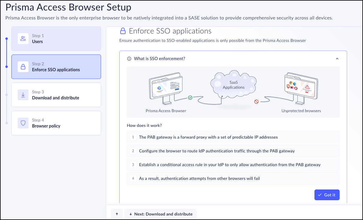 The steps that you see in your tenant depends on your Prisma Access Browser license; not all the onboarding steps are available for all licenses.