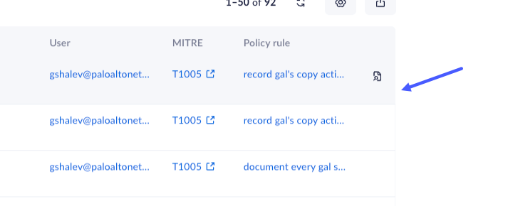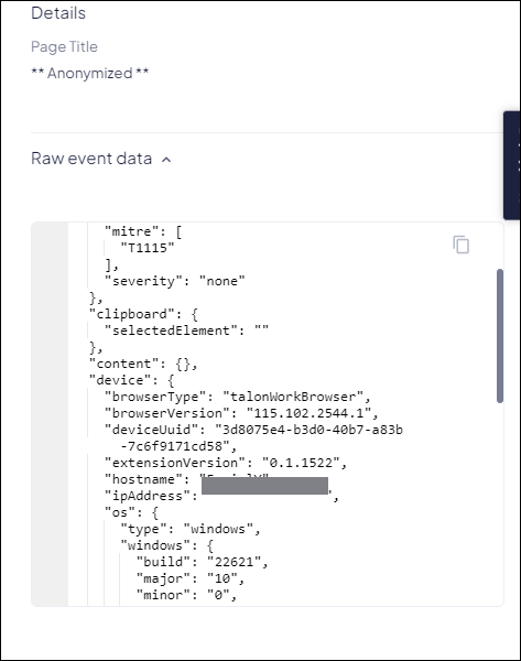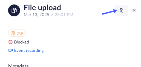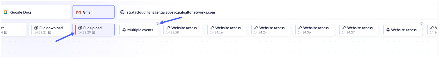 - The events that took place at the time. Blocked events are clearly marked with red bars on the left side, enabling quick identification of policy violations (e.g., blocked file upload attempts to Gmail). You can scroll through the events by either clicking on them using a mouse, or by using the arrow keys on the keyboard.