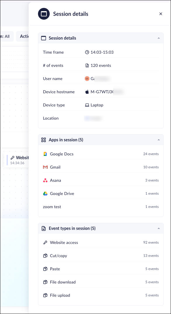 - Click Session details to obtain the basic metadata for the user/device that you want to investigate. The Session details includes:
