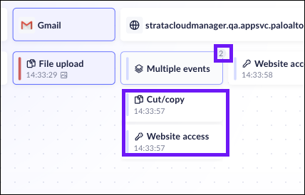 If multiple events occur at exactly the same second, the event will be marked Multiple Events, and a badge will display the count. To analyse the events, hover on the badge to see all the simultaneous events. If the events are exactly the same, the Activities Chain will display the badge with the event type named instead.