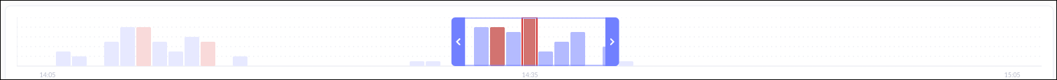 - Histogram: A visual representation of events per minute. The display shows a Red bar if there is at least one blocked event during that time frame. If it displays a Blue bar, there are no blocked events.The default view focuses on a 10-minute block (five minutes before and after the event), adjustable within a 1-hour window.