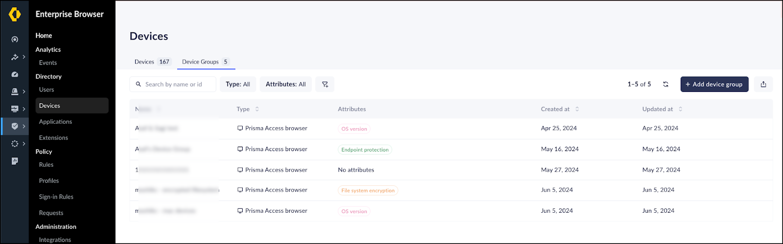 Add a device group.- From the Device groups tab, click Add device group.Name the device group.Select whether you want to create a device group for Prisma Access Browser endpoints or for Mobile devices.Select and configure the attributes that devices must match in order to be part of the device group.Attributes match against device criteria, such as whether the device has disk encryption enabled, active endpoint protection, or complex password policy requirements. Enforcing device group membership based on attributes provides a granular way for you to ensure that the devices Prisma Access Browser allows have good security posture. There are different attributes depending on whether you are creating a device group for Windows and macOS devices or for mobile devices.Click Create.To edit or delete a device group, hover over the device group name in the director and click the pencil icon (to edit) or the trash icon (to delete).Investigate devices using search and filters.