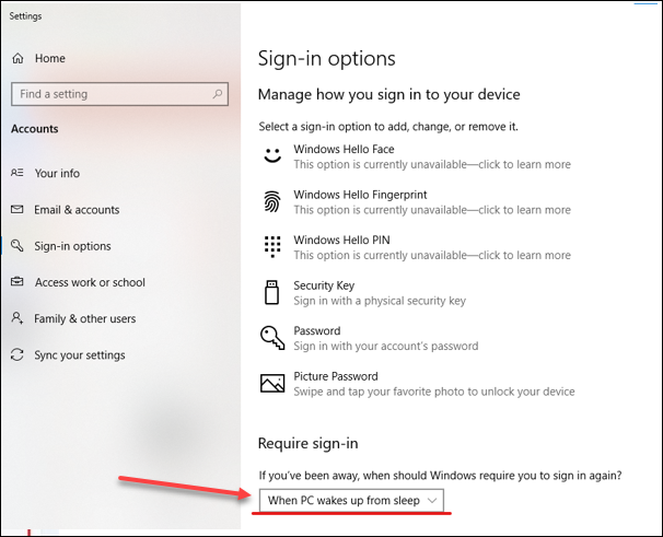 Selecting Never does not activate the screen lock.The Active Screen Lock is now activated.In Windows 10 devices, this option is found under Require sign-in.