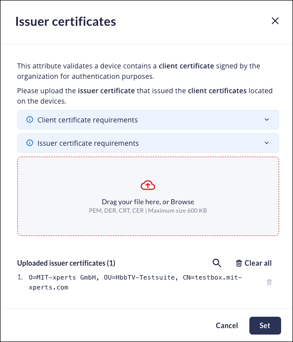Click Set.You need to upload issuer certificates that issued the client certificates located on the devices.Client Certificate Requirements:- Stored in the Current User → Personal stopr. [Windows only].