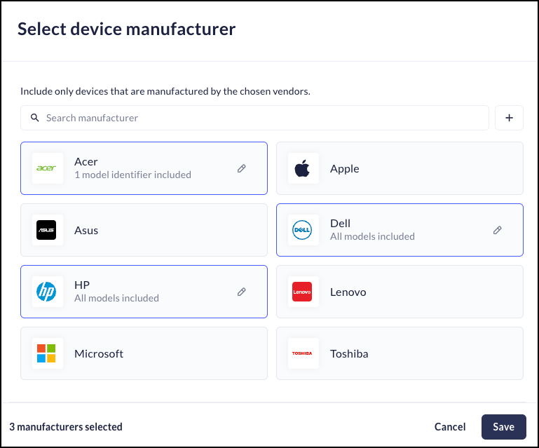 Use the device manufacturer attribute to restrict device group membership to Windows or macOS devices from selected manufacturers.- When you add or edit a device group, enable the device manufacturer attribute.Select the device manufacturers you want to support in the device group.