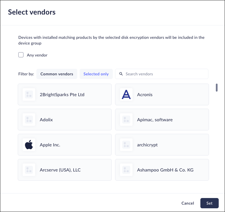 - Select Any vendor to include all vendors to include in the device group.