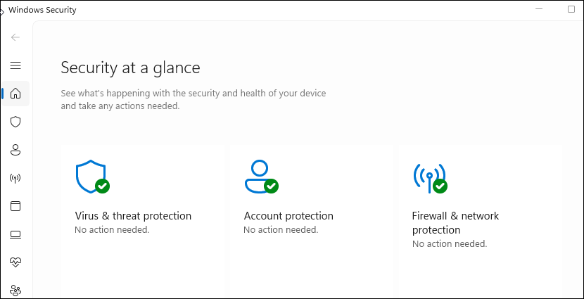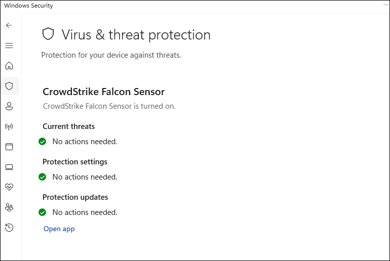 (Optional) Enable Verify definitions are up to date (supported vendors only) to add an additional check to ensure that the endpoint protection software on the device is up-to-date.Click Set.What does the Prisma Access Browser check?Windows devicesPrisma Access Browser checks the Endpoint Protection in the Windows Security Center. The posture check is made by checking that the Virus & threat protection is turned on.The Security at a glance page displays the Endpoint protection status of the device.