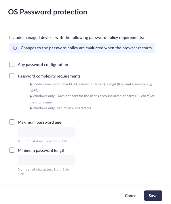 Use the OS password protection attribute to restrict device group membership to devices that are password protected. You can also specify that the device must have additional password policy enforced, such as password complexity, maximum age, or maximum length. To determine this, Prisma Access Browser looks for the following settings on the device:- Windows devices—Prisma Access Browser checks the following Password