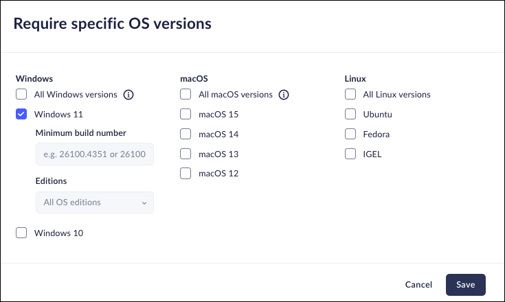 Define the list of acceptable operating system versions for the Prisma Access Browser posture mechanism to check as follows.