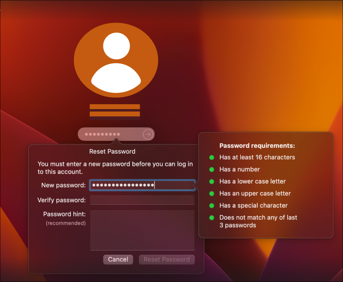 requirements in the management configuration profile (ManagementConfiguration profilesAddmacOSPassword): Allow simple value,