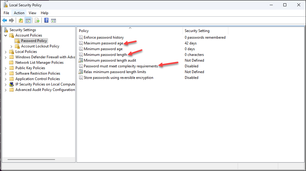 Policy settings in the local Security Settings (Security SettingsAccount PolicyPassword Policy): Maximum password age,