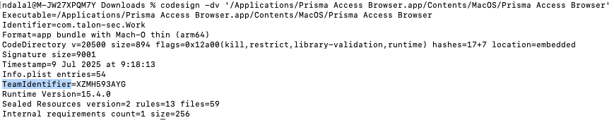 - For example codesign -dv '/Applications/Prisma Access Browser.app/Contents/MacOS/Prisma Access Browser' will provide te Team ID for the Prisma Access Browser.