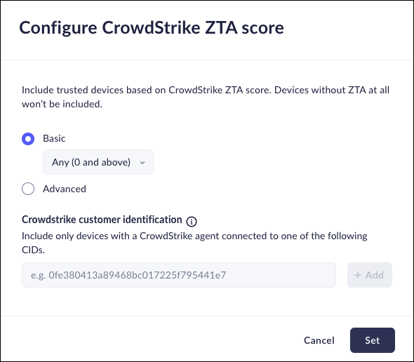 - Basic—Use the overall score that CrowdStrike assigns to the device, based on a range of Low (at least 65), Medium (at least 70), Strict (at least 80), or Very Strict (at least 95).