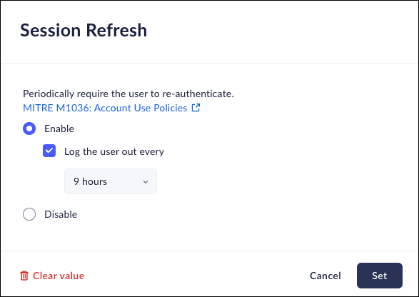 - Enable to enable Session Refresh, then select Log the user out every: and select an appropriate time frame, ranging from 1 hour to 30 days