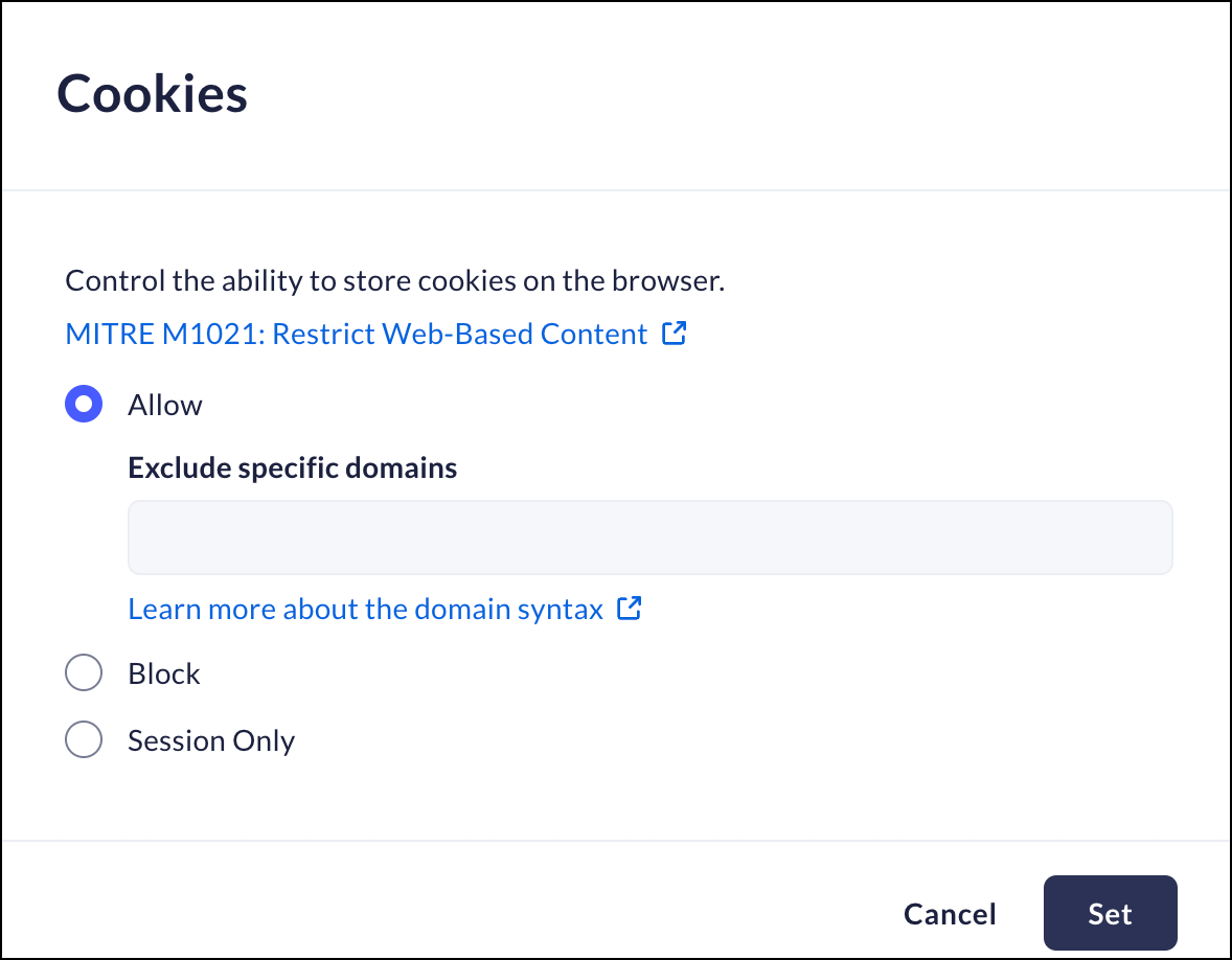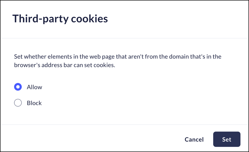 - From Strata Cloud Manager, select ConfigurationPrisma Access Browser PolicyProfilesBrowser SecuritySelect Third-party Cookies.Select one of the following options: