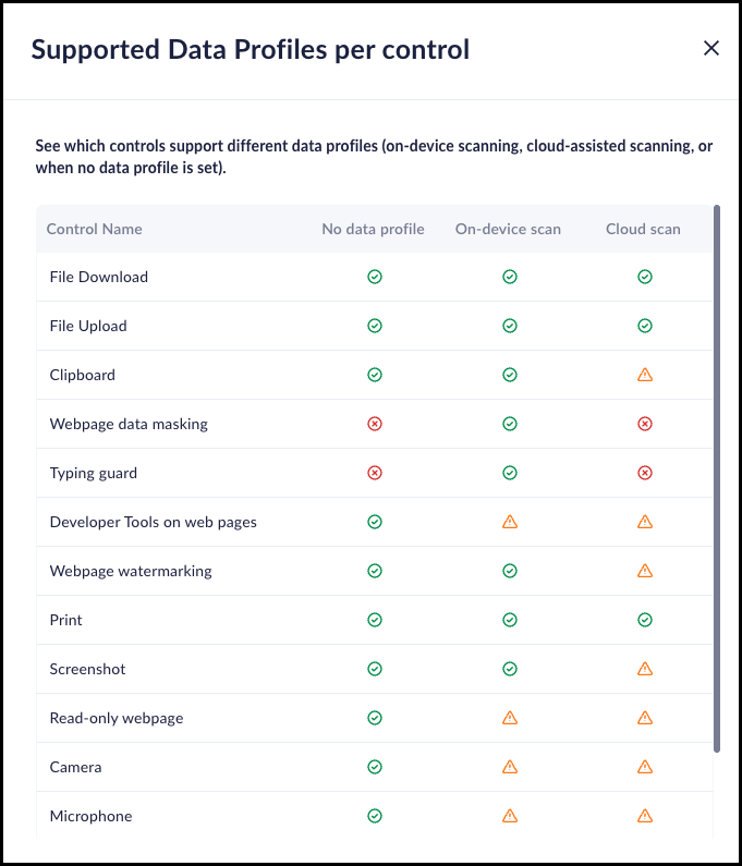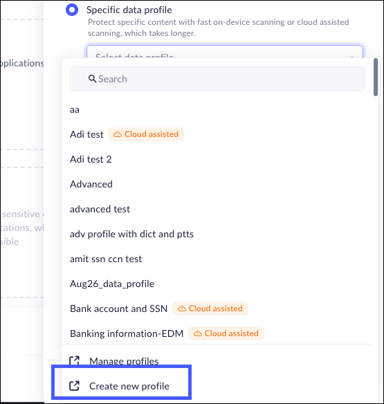 • Clipboard — Supported for On-device data profiles, not supported in cloud-assisted scans (but can still be applied ignoring the data profile selection).
