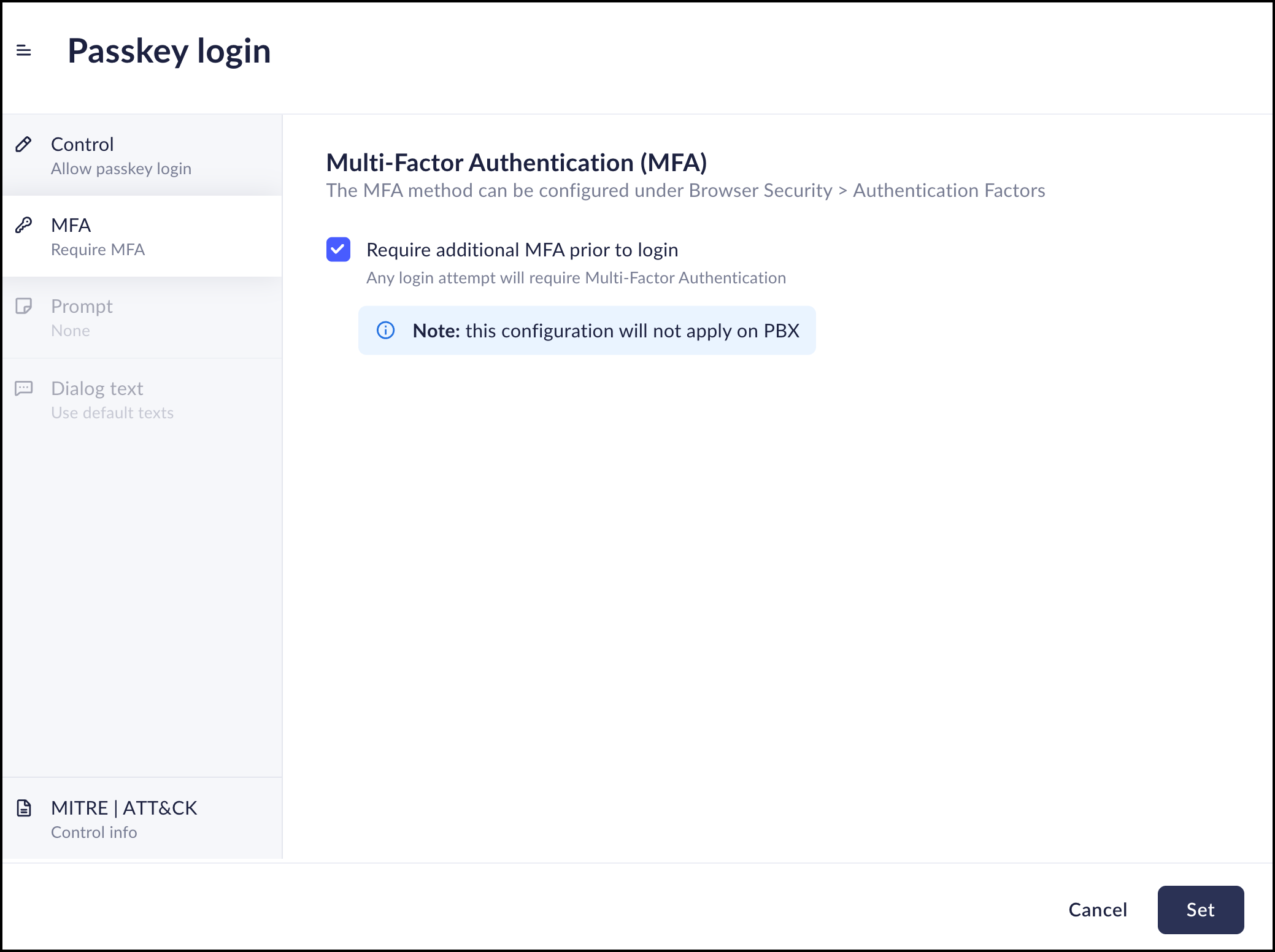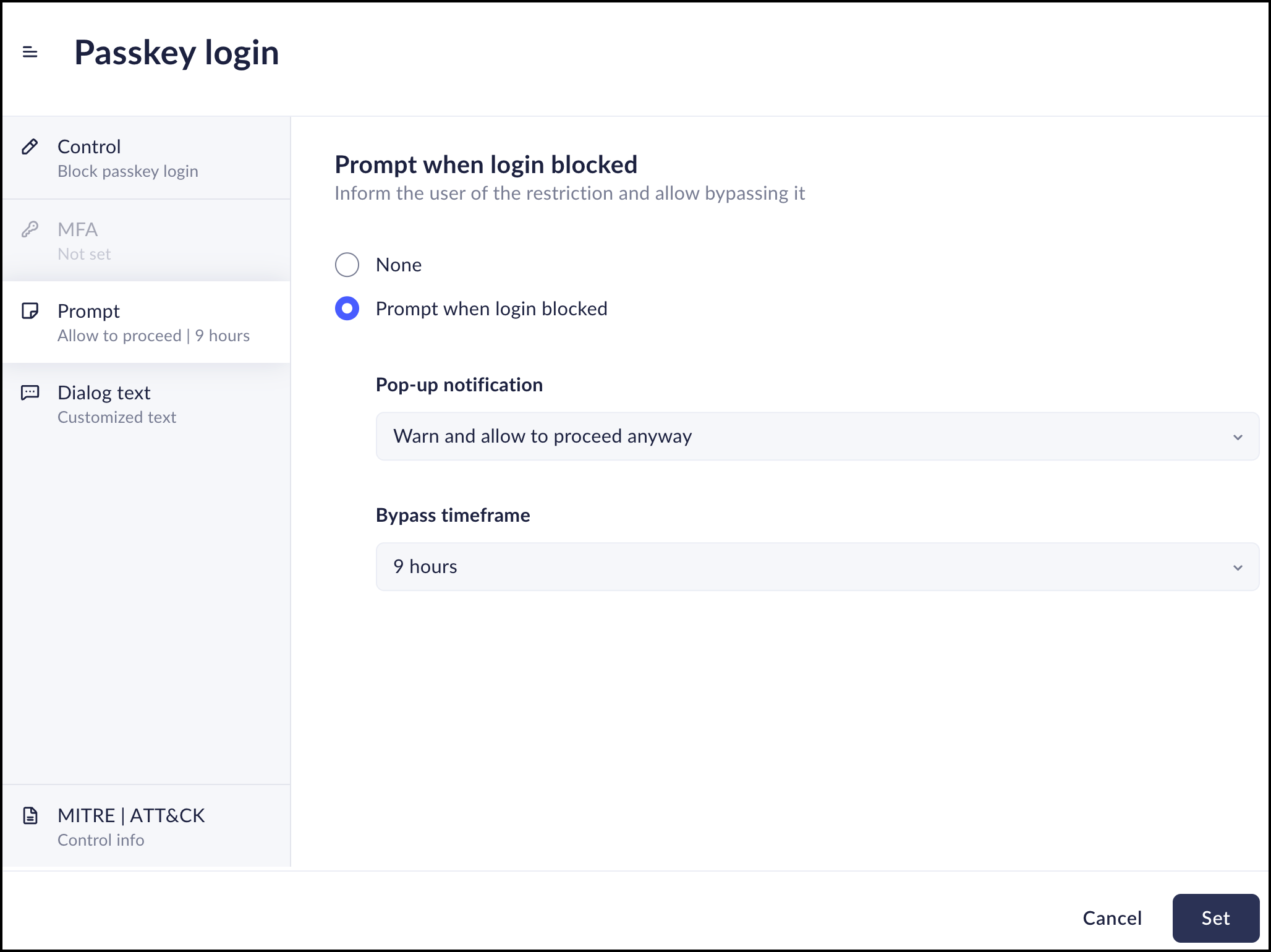 Click on the Passkey login tab to open Control Passkey login, and select one of the following options:- Allow - Logins using Passkeys will be permitted.Block - Logins with Passkeys will be blocked.