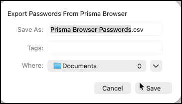 - Click Save. Choose the CSV file to import your logins into the Prisma Browser Password Manager.
