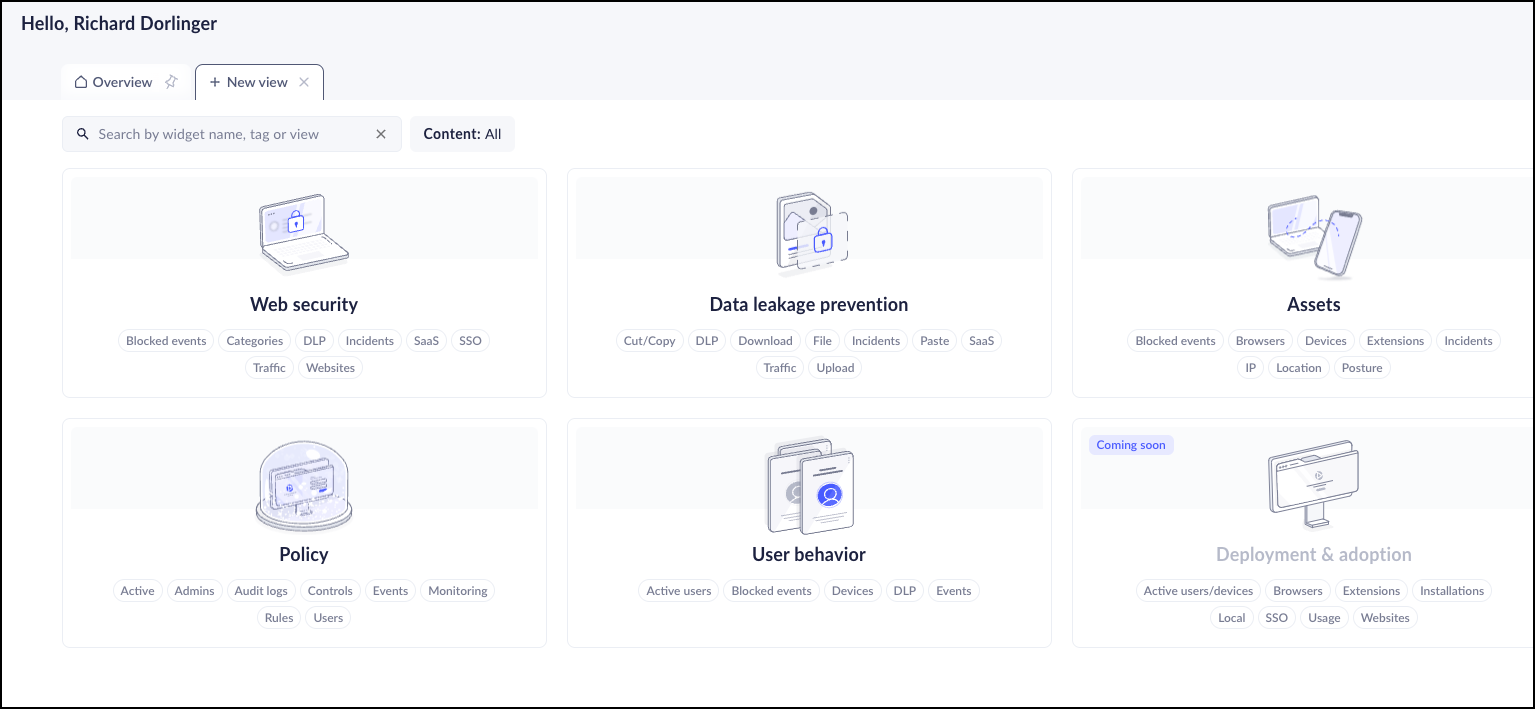 To add additional Prisma Access Browser dashboards to the display, click the + icon and select a dashboard to open in a new tab (up to a total of 12 tabs).In addition to the Overview dashboard that displays by default, the following dashboards are available:You can open a total of 12 dashboard tabs, including opening multiple instances of the same dashboard.