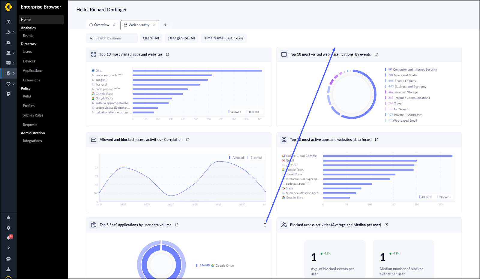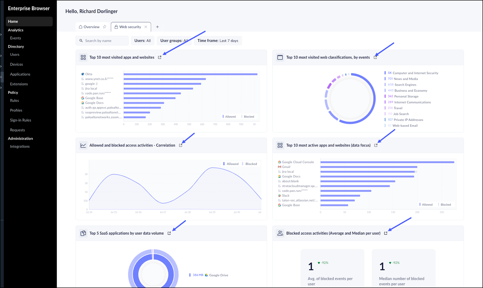 The Prisma Access Browser dashboards deliver real-time, relevant data, and metrics for