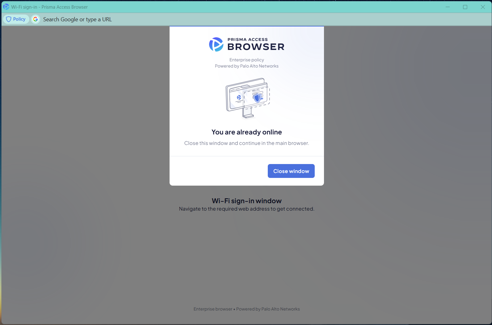 After authentication and restored connectivity:- Prisma Browser detects that the internet connection is active.