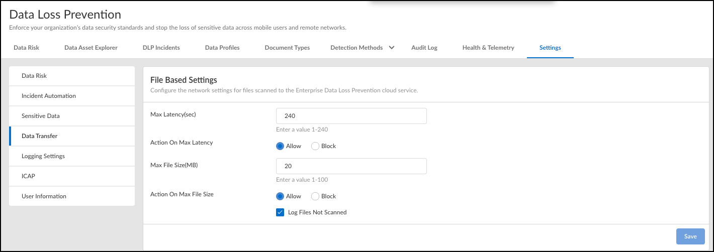 • Fail Block: If the EDLP action is set to Block, any scan that fails to complete within the threshold is treated as a "fail block," and the file is prevented from being uploaded/downloaded/printed, even if the Prisma Browser policy is set to allow the file action upon a match.