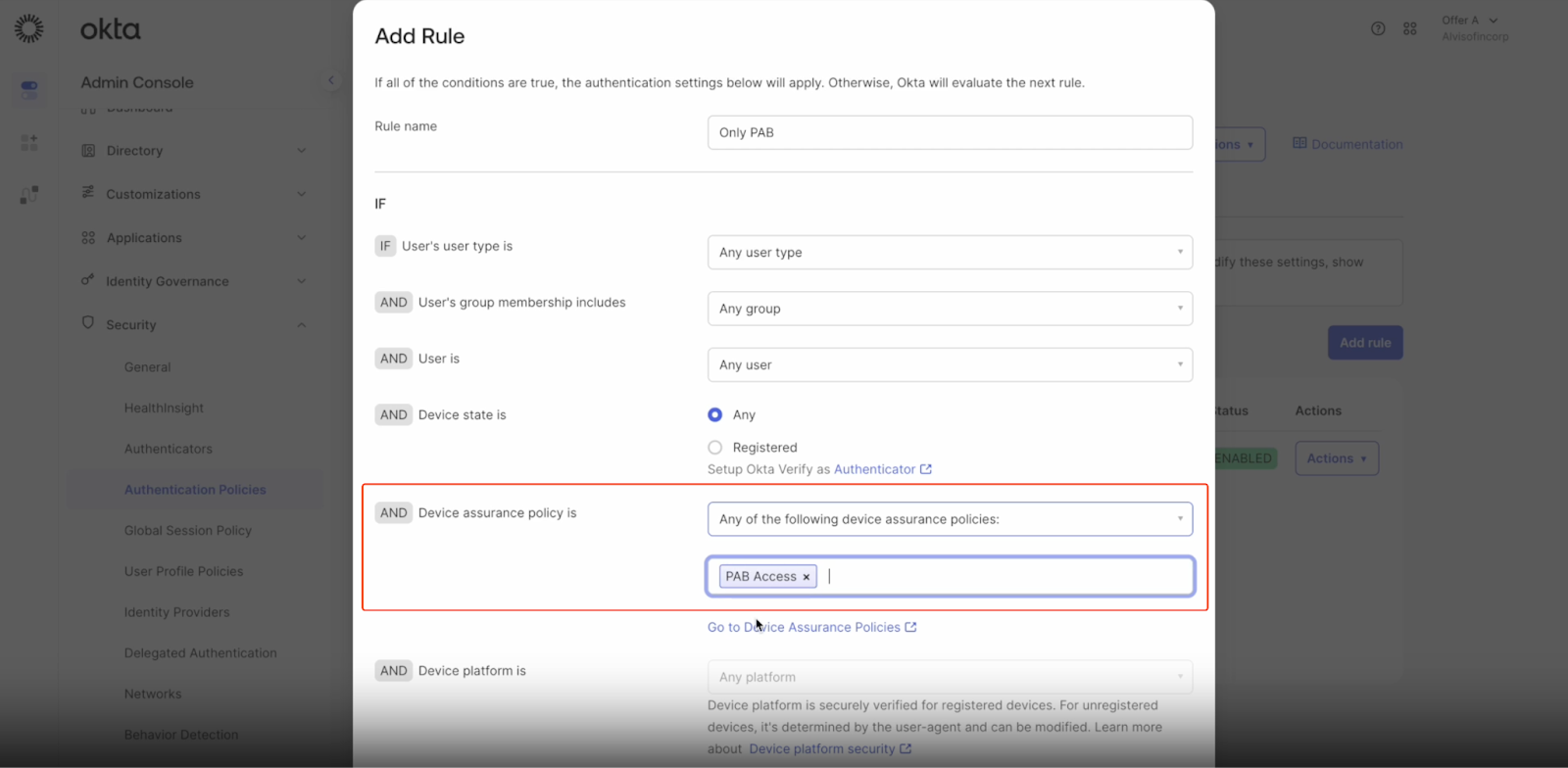 4. In the Device Assurance policy is, select Any of the following device assurance policies.